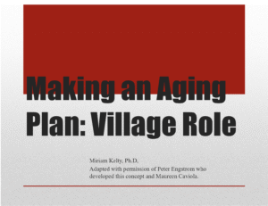 Planning is an important part of preparing for the inevitable changes that come with aging. Deliberate planning can help us think through common issues & problems of aging. A Master Aging Plan can be a helpful framework. As a starting point, we offer a resource prepared by Miriam Kelty, Making an Aging Plan: Village Role.