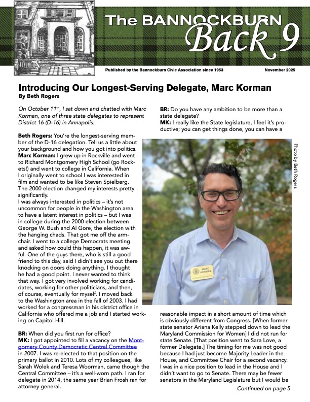The BCA represents the Bannockburn community before government and civic bodies on zoning, roads, schools, legislation, and other civic issues; publishes the Bannockburn Community Directory and The Bannockburn Back9 newsletter; and sponsors this website. Its Woodlands Stewards Group, established in 2024, has been working to protect and preserve Bannockburn’s natural areas. The BCA also holds a board position on the Glen Echo Park Partnership for Arts and Culture, Inc.